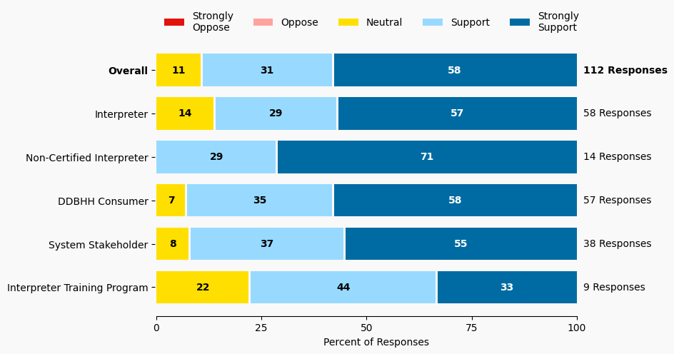 The stacked bar charts show how respondents rated their level of support and the total number of responses. The percentage for the five support levels is shown from left to right: Strongly Oppose (Dark Red), Oppose (Light Red), Neutral (Yellow), Support (Light Blue), and Strongly Support (Dark Blue).