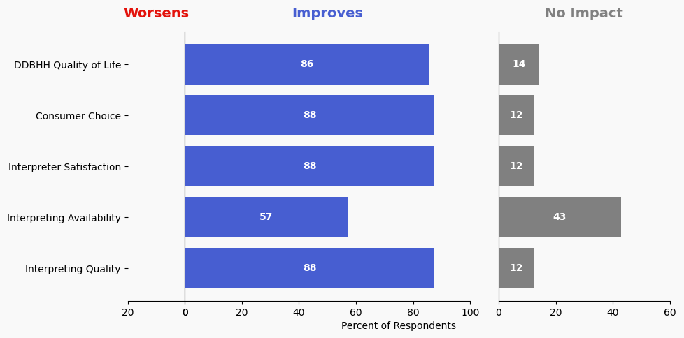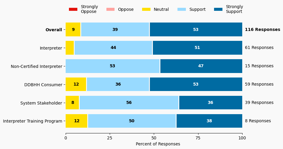 The stacked bar charts show how respondents rated their level of support and the total number of responses. The percentage for the five support levels is shown from left to right: Strongly Oppose (Dark Red), Oppose (Light Red), Neutral (Yellow), Support (Light Blue), and Strongly Support (Dark Blue).