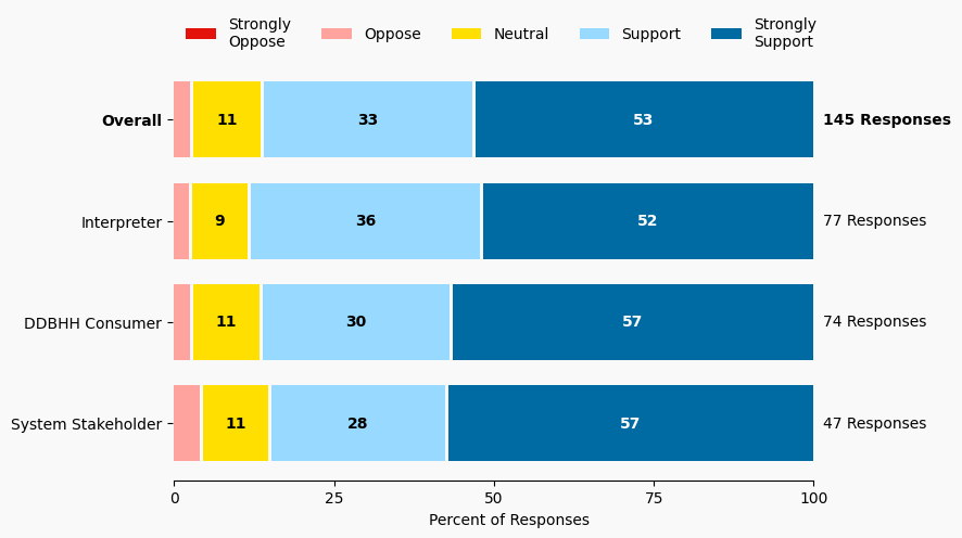 The stacked bar charts show how respondents rated their level of support and the total number of responses. The percentage for the five support levels is shown from left to right: Strongly Oppose (Dark Red), Oppose (Light Red), Neutral (Yellow), Support (Light Blue), and Strongly Support (Dark Blue).