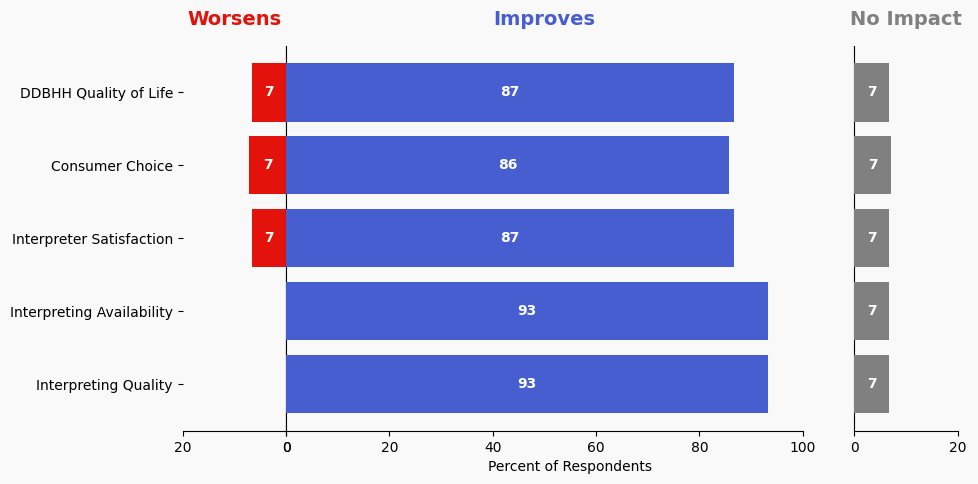 The stacked bar charts show how respondents assessed the effectiveness of this solution based on five metrics. For each metric, the percentage of respondents is shown from left to right: Worsens (Red), Improves (Blue), No Impact (Gray).