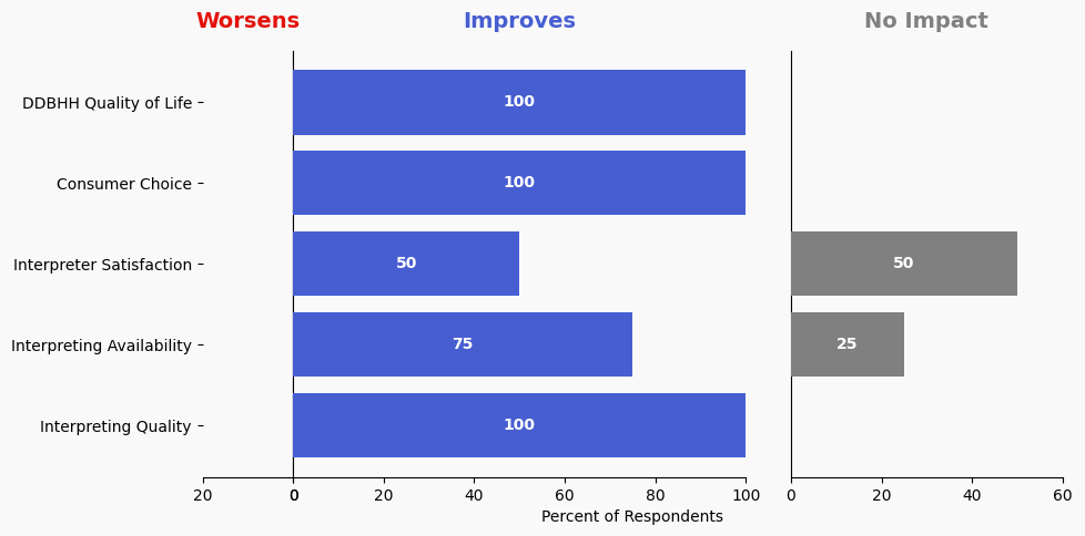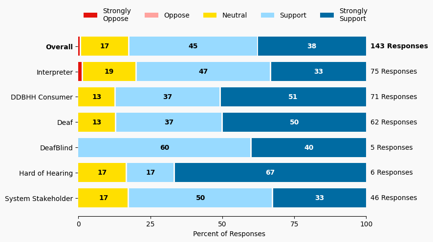 The stacked bar charts show how respondents rated their level of support and the total number of responses. The percentage for the five support levels is shown from left to right: Strongly Oppose (Dark Red), Oppose (Light Red), Neutral (Yellow), Support (Light Blue), and Strongly Support (Dark Blue).