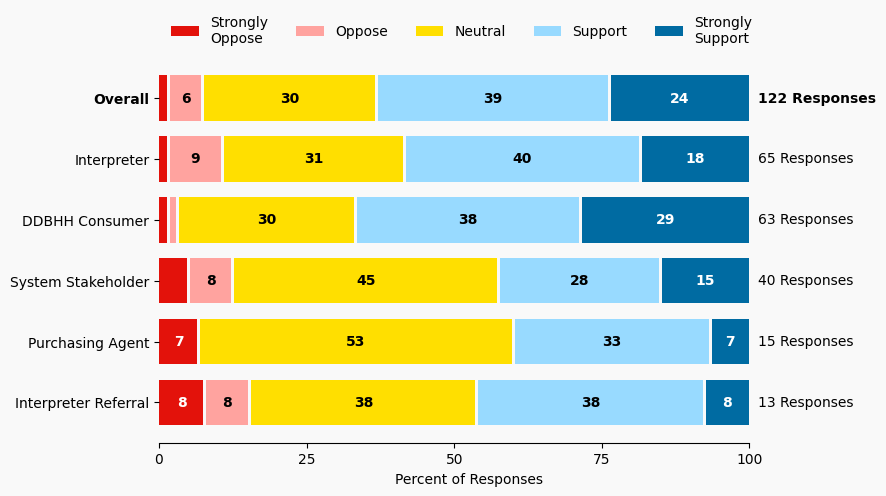 The stacked bar charts show how respondents rated their level of support and the total number of responses. The percentage for the five support levels is shown from left to right: Strongly Oppose (Dark Red), Oppose (Light Red), Neutral (Yellow), Support (Light Blue), and Strongly Support (Dark Blue).
