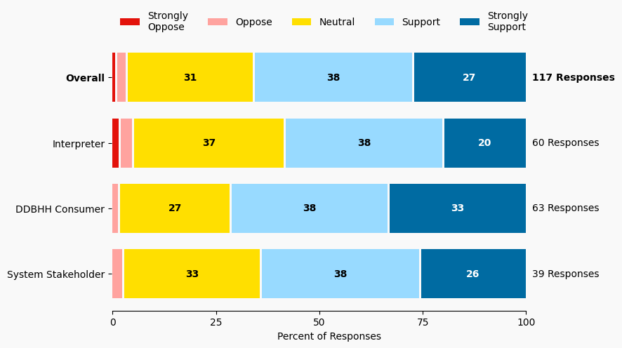 The stacked bar charts show how respondents rated their level of support and the total number of responses. The percentage for the five support levels is shown from left to right: Strongly Oppose (Dark Red), Oppose (Light Red), Neutral (Yellow), Support (Light Blue), and Strongly Support (Dark Blue).