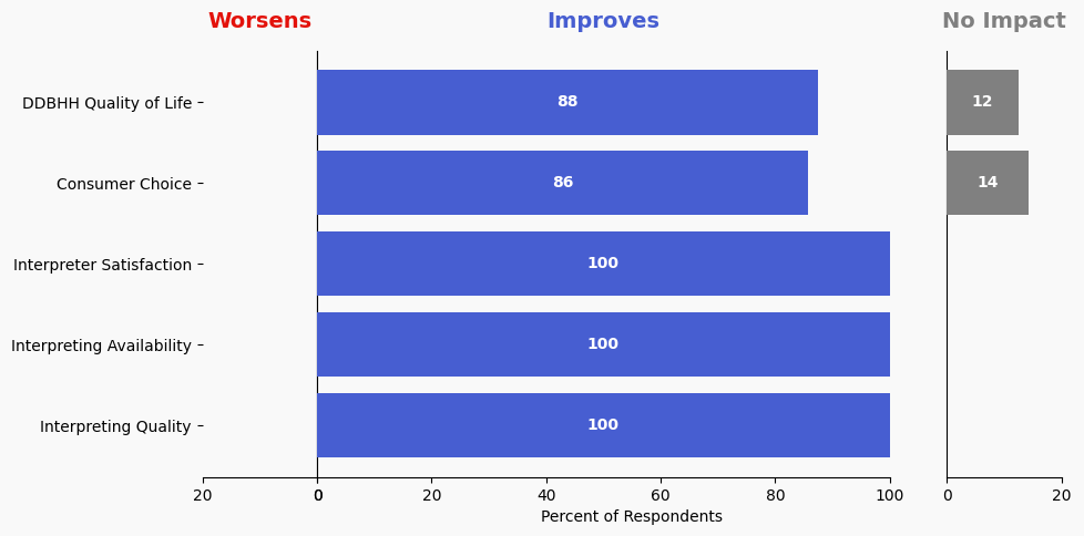 The stacked bar charts show how respondents assessed the effectiveness of this solution based on five metrics. For each metric, the percentage of respondents is shown from left to right: Worsens (Red), Improves (Blue), No Impact (Gray).