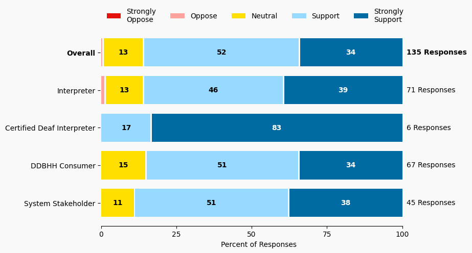 The stacked bar charts show how respondents rated their level of support and the total number of responses. The percentage for the five support levels is shown from left to right: Strongly Oppose (Dark Red), Oppose (Light Red), Neutral (Yellow), Support (Light Blue), and Strongly Support (Dark Blue).