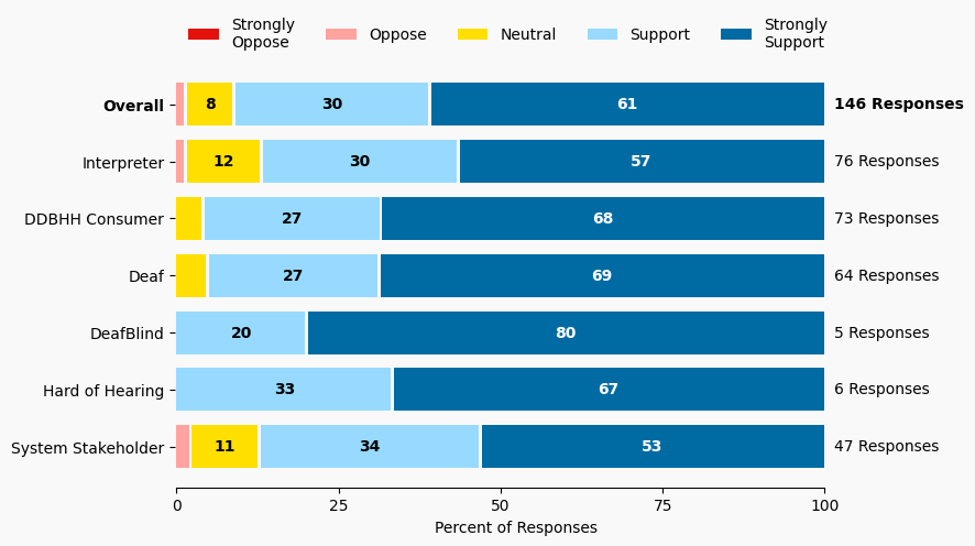 The stacked bar charts show how respondents rated their level of support and the total number of responses. The percentage for the five support levels is shown from left to right: Strongly Oppose (Dark Red), Oppose (Light Red), Neutral (Yellow), Support (Light Blue), and Strongly Support (Dark Blue).