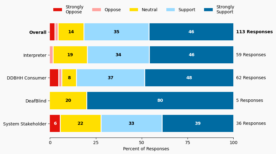 The stacked bar charts show how respondents rated their level of support and the total number of responses. The percentage for the five support levels is shown from left to right: Strongly Oppose (Dark Red), Oppose (Light Red), Neutral (Yellow), Support (Light Blue), and Strongly Support (Dark Blue).