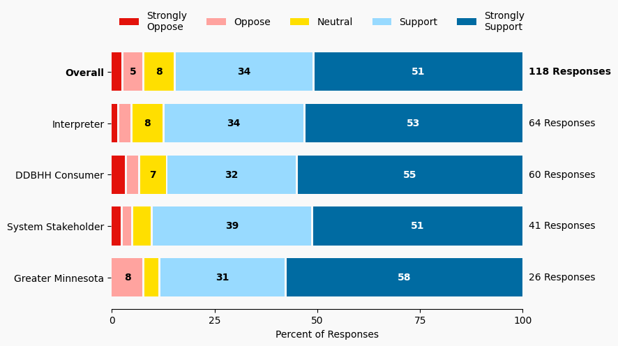 The stacked bar charts show how respondents rated their level of support and the total number of responses. The percentage for the five support levels is shown from left to right: Strongly Oppose (Dark Red), Oppose (Light Red), Neutral (Yellow), Support (Light Blue), and Strongly Support (Dark Blue).