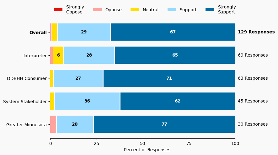 The stacked bar charts show how respondents rated their level of support and the total number of responses. The percentage for the five support levels is shown from left to right: Strongly Oppose (Dark Red), Oppose (Light Red), Neutral (Yellow), Support (Light Blue), and Strongly Support (Dark Blue).