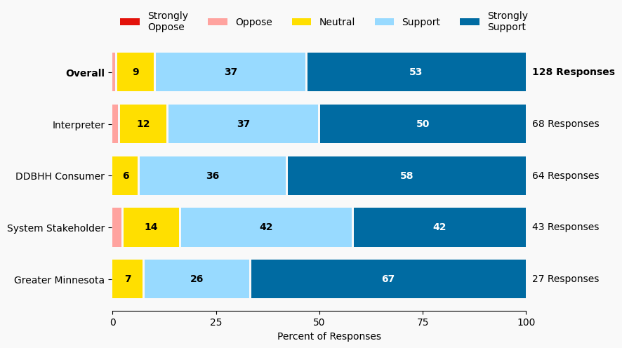 The stacked bar charts show how respondents rated their level of support and the total number of responses. The percentage for the five support levels is shown from left to right: Strongly Oppose (Dark Red), Oppose (Light Red), Neutral (Yellow), Support (Light Blue), and Strongly Support (Dark Blue).