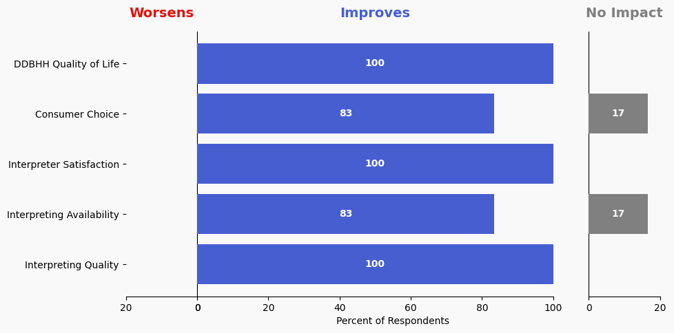 The stacked bar charts show how respondents assessed the effectiveness of this solution based on five metrics. For each metric, the percentage of respondents is shown from left to right: Worsens (Red), Improves (Blue), No Impact (Gray).