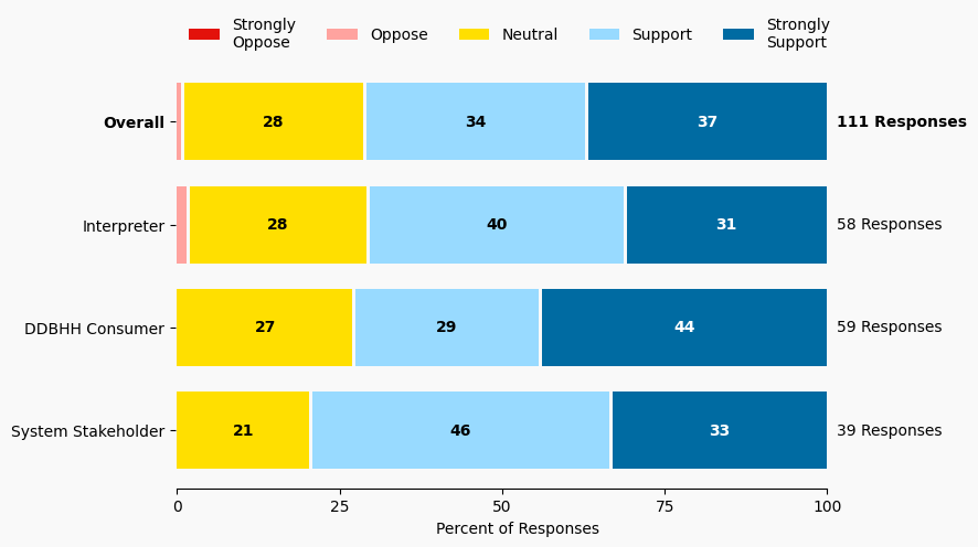 The stacked bar charts show how respondents rated their level of support and the total number of responses. The percentage for the five support levels is shown from left to right: Strongly Oppose (Dark Red), Oppose (Light Red), Neutral (Yellow), Support (Light Blue), and Strongly Support (Dark Blue).