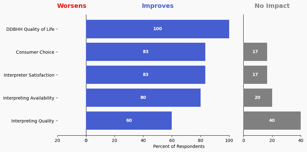The stacked bar charts show how respondents assessed the effectiveness of this solution based on five metrics. For each metric, the percentage of respondents is shown from left to right: Worsens (Red), Improves (Blue), No Impact (Gray).