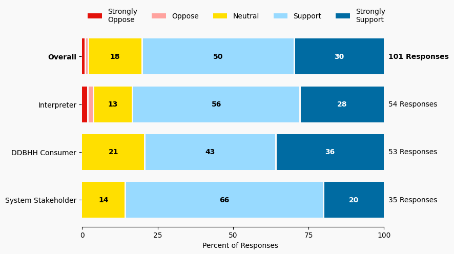 The stacked bar charts show how respondents rated their level of support and the total number of responses. The percentage for the five support levels is shown from left to right: Strongly Oppose (Dark Red), Oppose (Light Red), Neutral (Yellow), Support (Light Blue), and Strongly Support (Dark Blue).