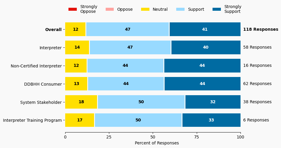 The stacked bar charts show how respondents rated their level of support and the total number of responses. The percentage for the five support levels is shown from left to right: Strongly Oppose (Dark Red), Oppose (Light Red), Neutral (Yellow), Support (Light Blue), and Strongly Support (Dark Blue).